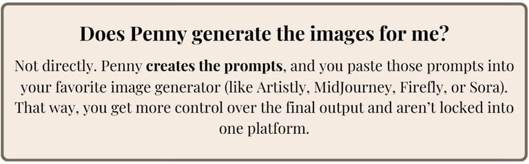 No more guessing what should go into your bundles. Penny thinks for you and writes polished prompts for your AI image generator - so you can skip the stress and go straight to creating professional-looking packs.